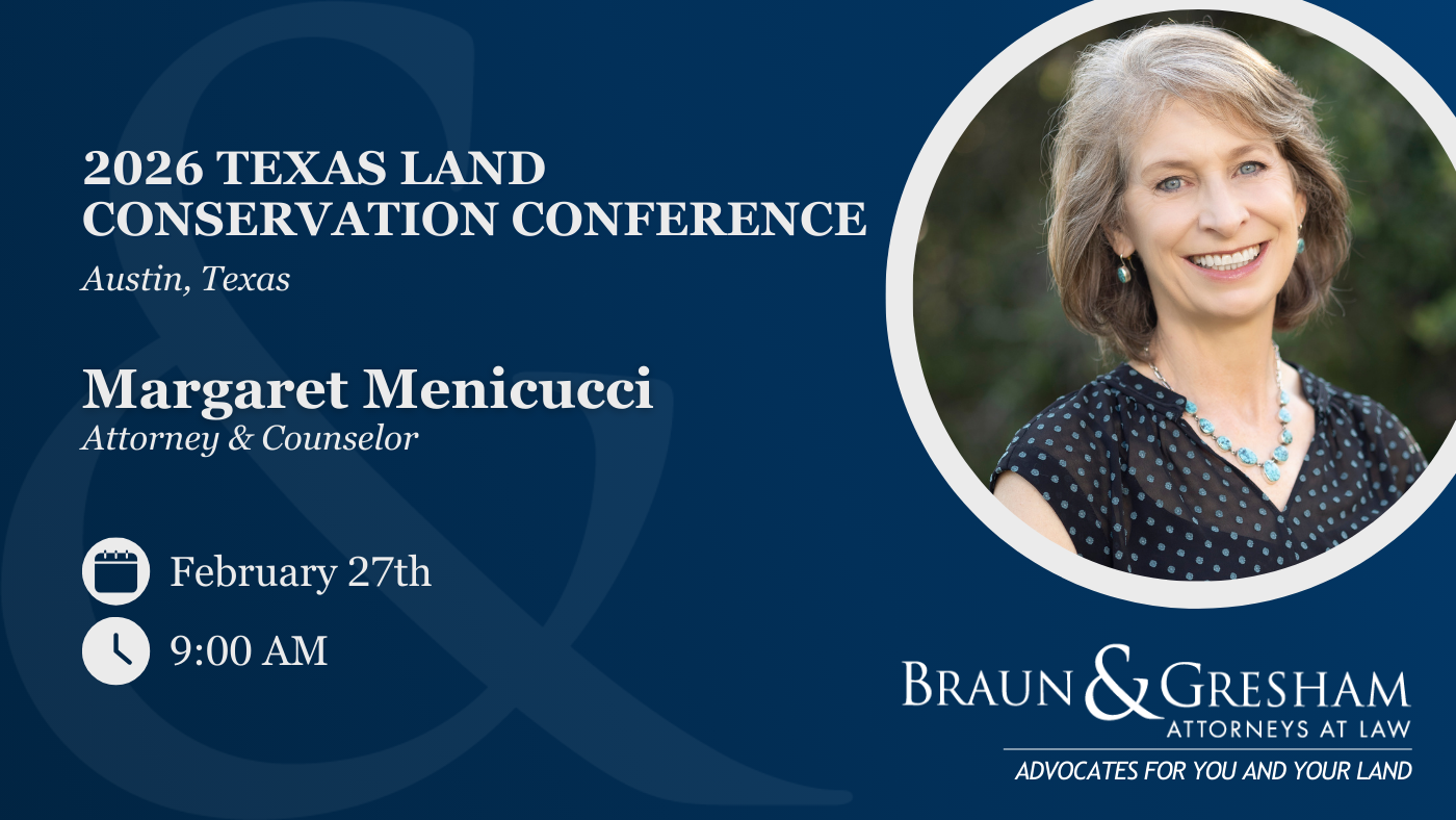Join Attorney & Counselor Margaret Menicucci of Braun & Gresham at the 2026 Texas Land Conservation Conference for a panel discussion focused on the evolving role of conservation easements in Texas and how thoughtful amendments can strengthen long-term land protection.