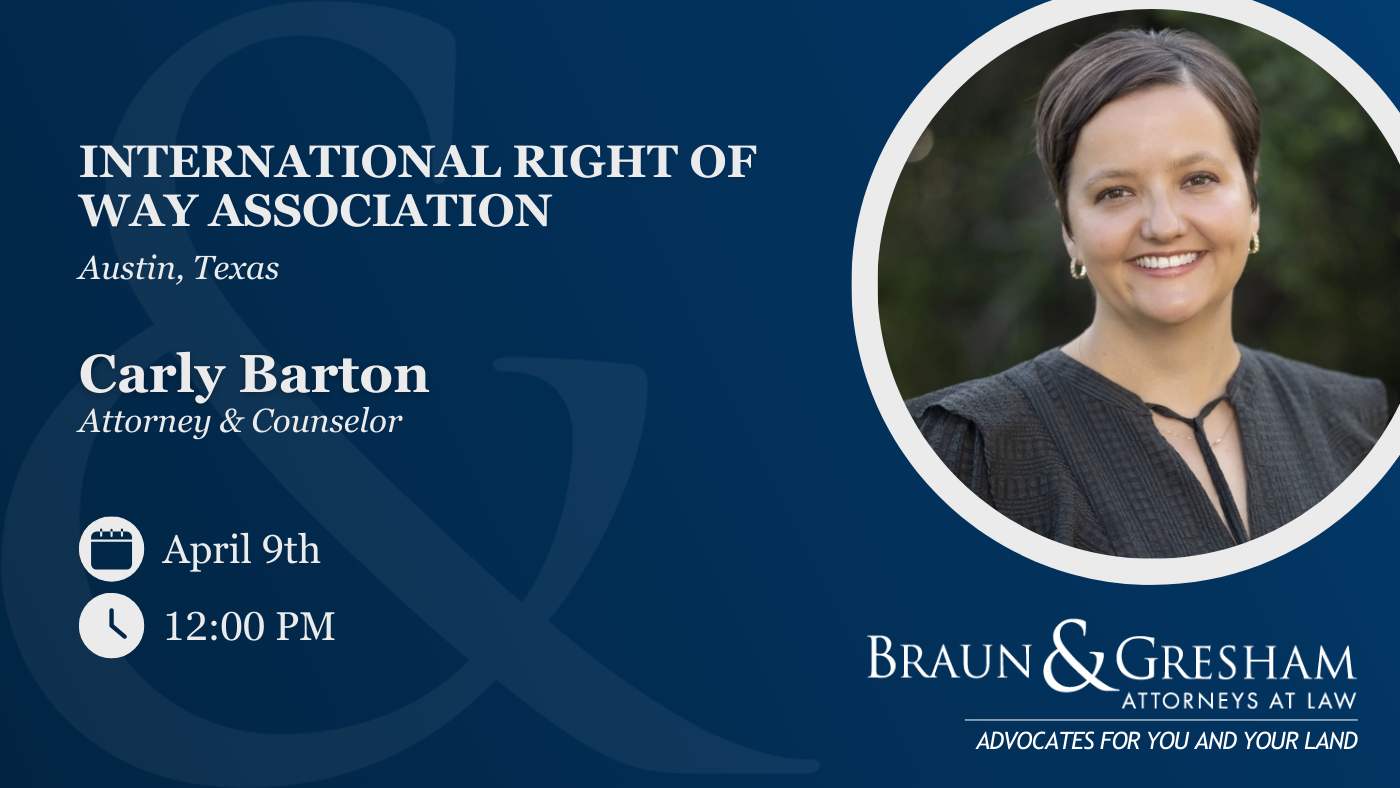 Join Attorney & Counselor Carly Barton of Braun & Gresham for the International Right of Way Association (IRWA) Austin Chapter 74 Luncheon, where she will present on the emerging development of 765-kV transmission lines in Texas and the legal processes that shape transmission routing and property acquisition.