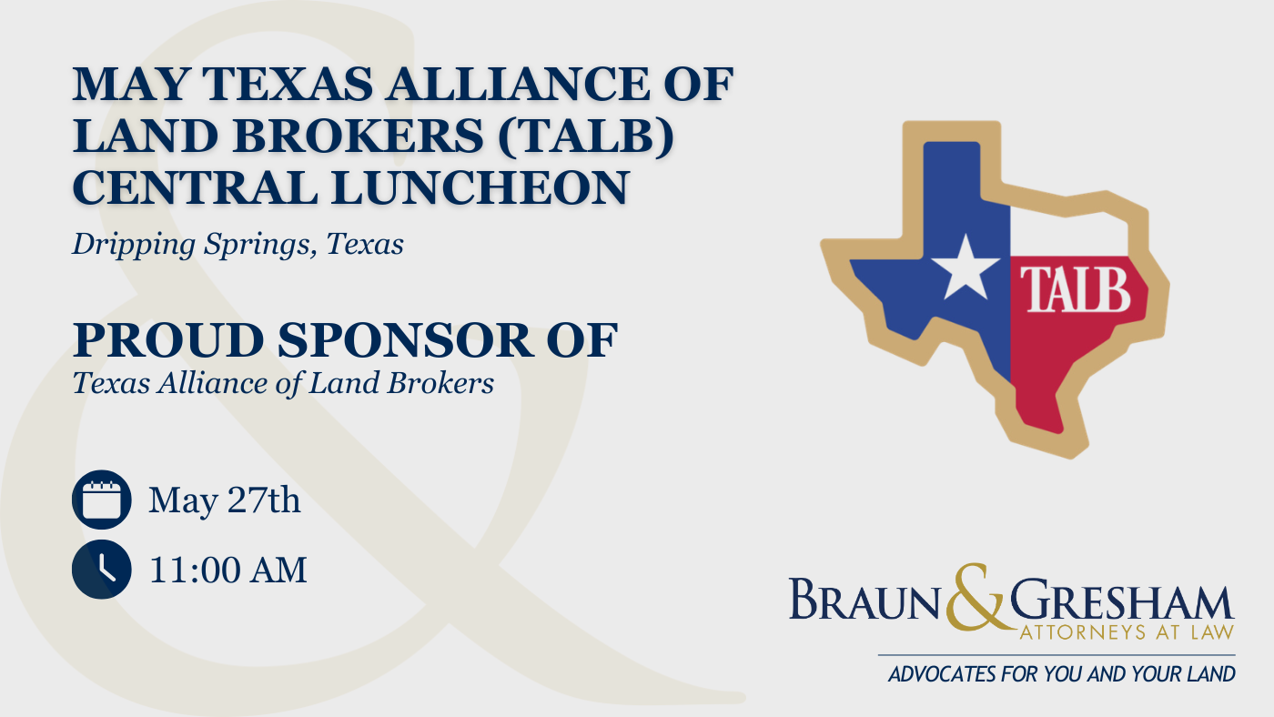 Braun & Gresham is pleased to sponsor the May Texas Alliance of Land Brokers (TALB) Central Luncheon at Dripping Springs Distilling on May 27th.